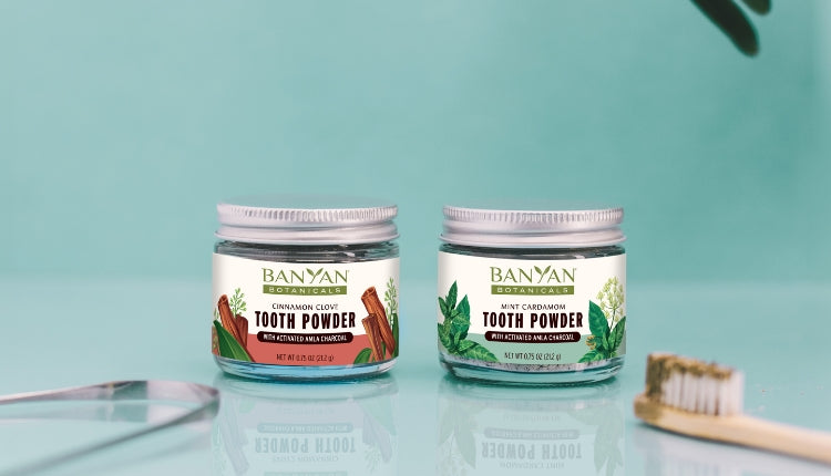 - Then brush with Tooth Powder for a bright, healthy smile. This non-toxic blend of herbs and minerals includes miswak, neem, activated charcoal, and baking soda, and is available in mint cardamom flavor.