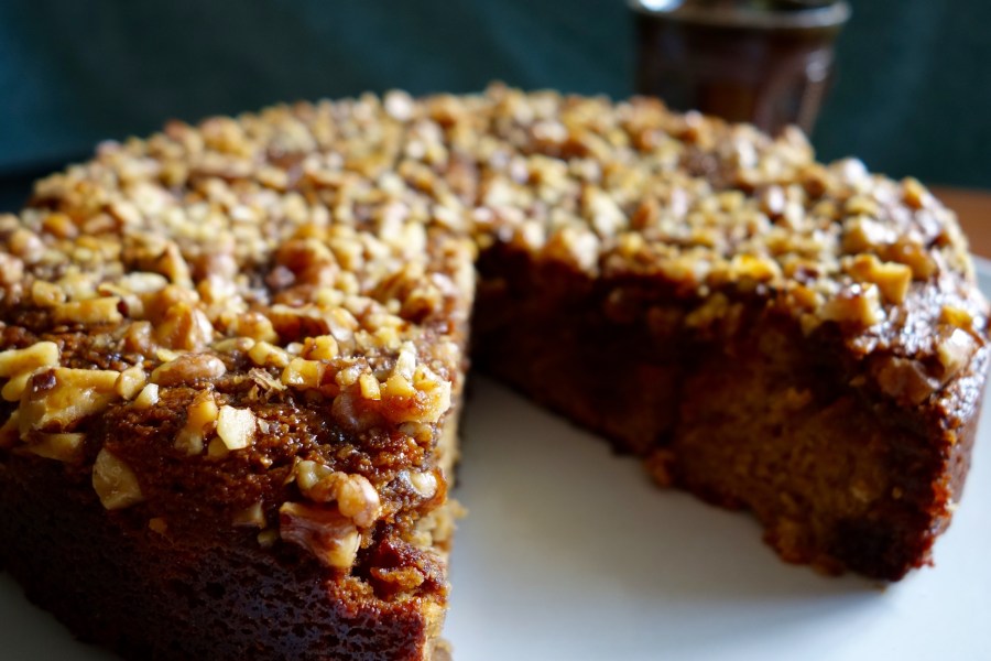 Scrape into your lined tin, and sprinkle over the chopped walnuts. Bake in a pre-heated oven (160c) for around 50 mins until a skewer comes out clean. Pour the remaining coffee syrup over the hot cake, and let it cool in the tin – this cake is deliciously moist! Store in refrigerator – it gets even better the second day. I liked it with a dollop of yoghurt on the side.